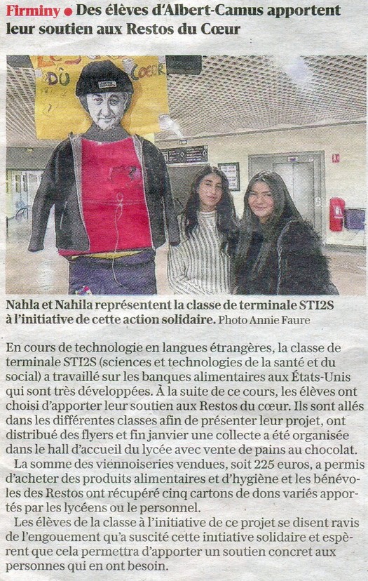 Des élèves d’Albert Camus apportent leur soutien aux Restos du Coeur Article paru dans La Tribune Le Progrès du 31 janvier 2025 Article mis en ligne le 3 février 2025 par Agnès Granjon