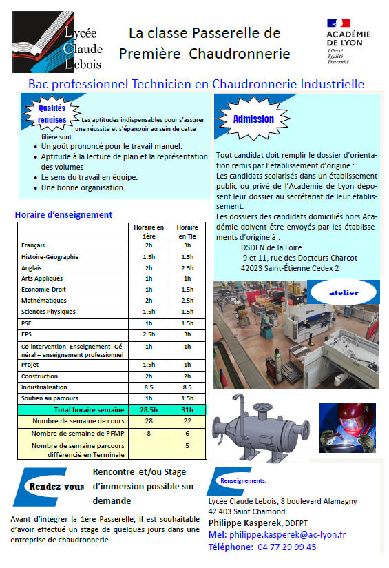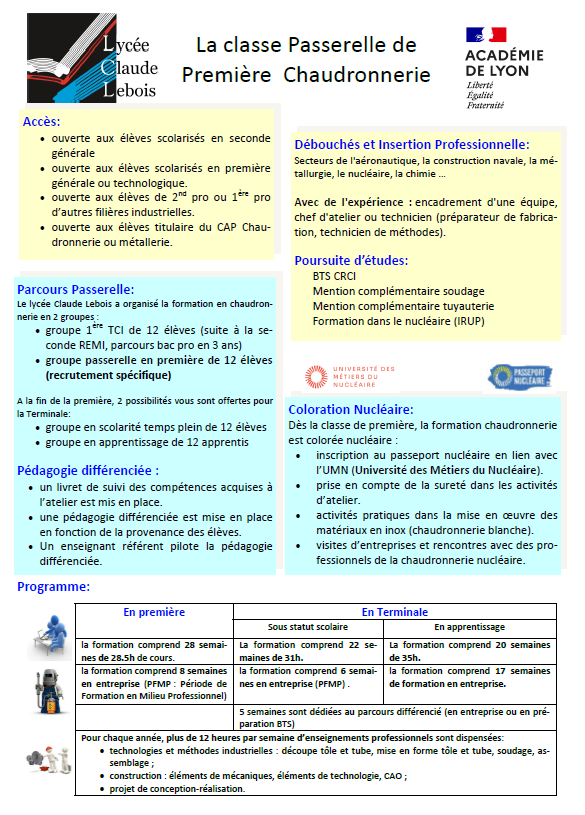 Le lycée professionnel Claude Lebois ouvrira, dès la rentrée 2025, une classe Passerelle de Première Chaudronnerie (12 places).