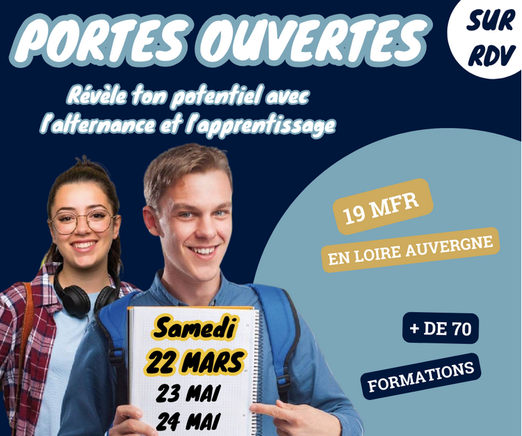 La fédération territoriale des MFR Loire-Auvergne vous accueille lors de ses Journées Portes Ouvertes organisées le samedi 22 mars 2025, les vendredi 23 et samedi 24 mai 2025... Sur rendez-vous uniquement !