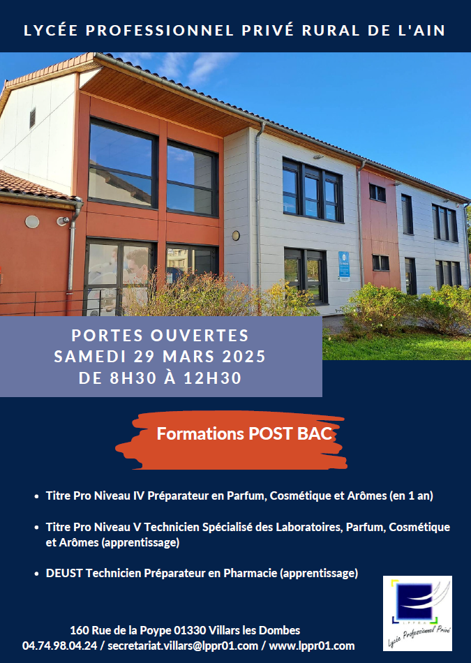 Le Lycée Professionnel Privé Rural de l’Ain, Villars-les-Dombes vous accueille lors de sa Journée Portes Ouvertes organisée le samedi 29 mars 2025 de 8h30 à 12h30.