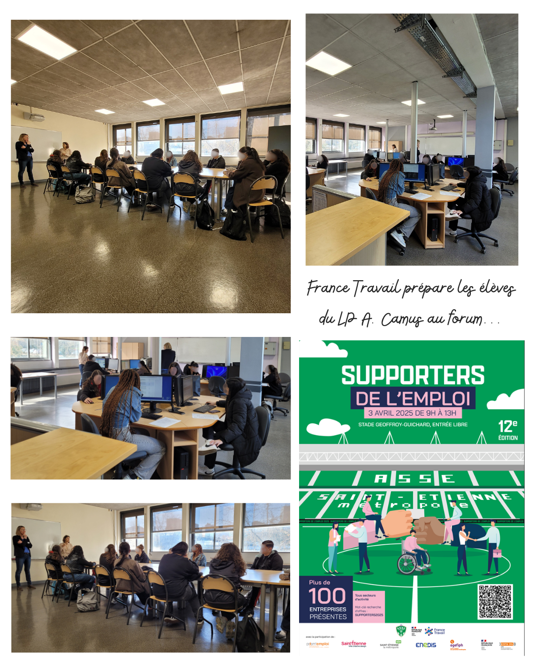 En partenariat avec France Travail, 16 élèves de terminale bac’ pro’ inscrits dans la parcours "Préparation à l’insertion professionnelle" ont préparé durant 3 heures leur participation au Forum "Supporters de l’emploi 2025"... Au programme du jeudi 20 mars 2025 de 8h30 à 11h30, dans les locaux du LP A. Camus :